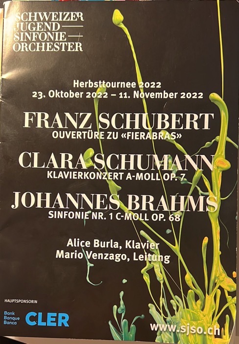 On Sunday the 6th November, I went to one of the most incredible concerts of my life at the Bern Casino. Walking into the hall, I was overcome with anticipation for the piece de resistance of this programme—Clara Schumann’s Piano Concert. A staple in her catalogue of compositions. A groundbreaking, unconventional, virtuosic piece that will emotionally transport you.
